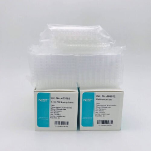 Tuýp PCR 0.1 có 8 tríp, bao gồm nắp, mã code: 403102+406012, do NEST sản xuất. Hộp có 125 tubes và 125 nắp