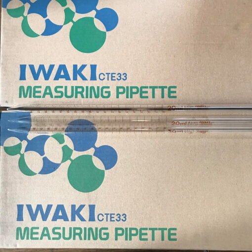 Pipette thủy tinh là dụng cụ giống như ống hút. Ống pipette này có chia vạch cuối, dung tích 20ml. Hãng sản xuất Iwaki Nhật bản, LMS Đức
